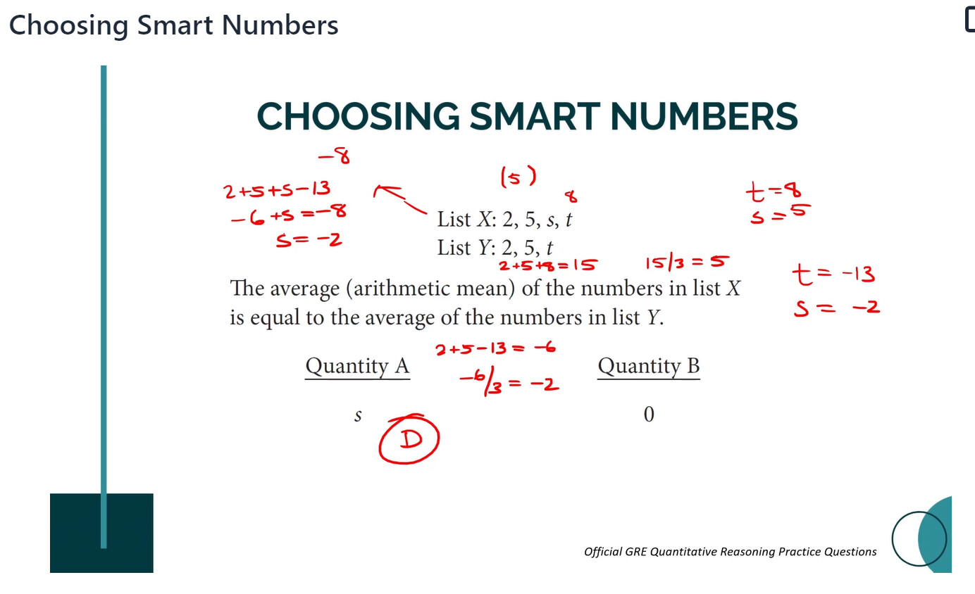 For this, if s = 0, it would mean that for List 1 it is 2+5+t, but divided by 4 to get the mean; versus for List 2 where it is 2+5+t, but divided by 3 to get the mean. Which means that the average for List 1 will be smaller since its the same numerator but divided by a larger denominator. As such, in order for both means to be the same (i.e., balance out the larger denominator), something positive needs to be added on to 2+5+t (i.e., s needs to be > 0). Hence answer is A