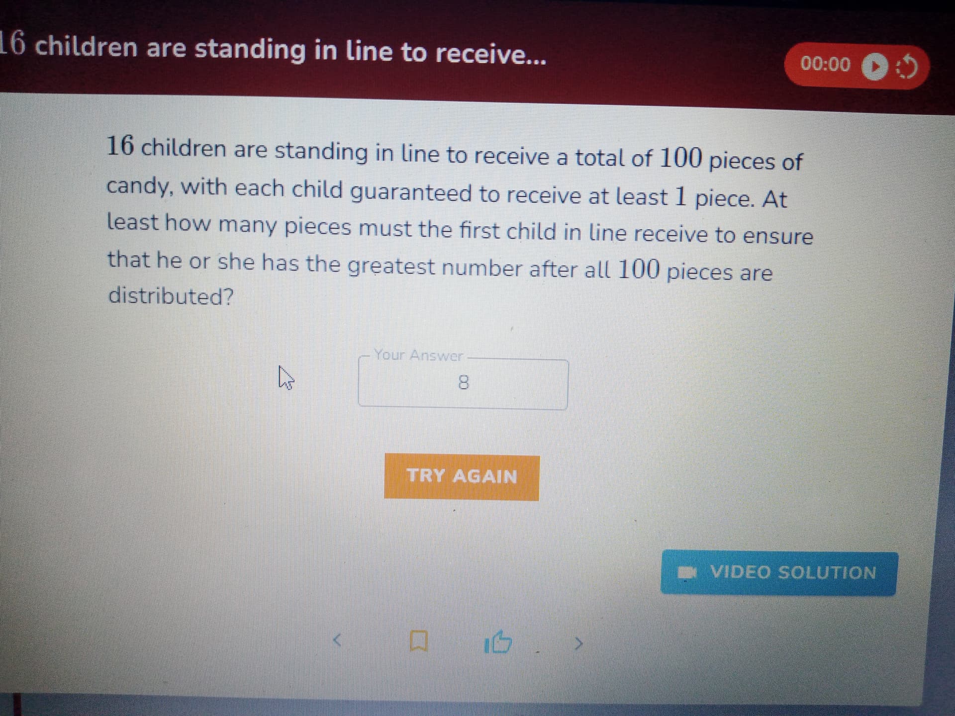 The answer would be 9 if I’m not wrong. The question is basically asking what would be the least number of chocolates that would guarantee the first child would have max chocolates.