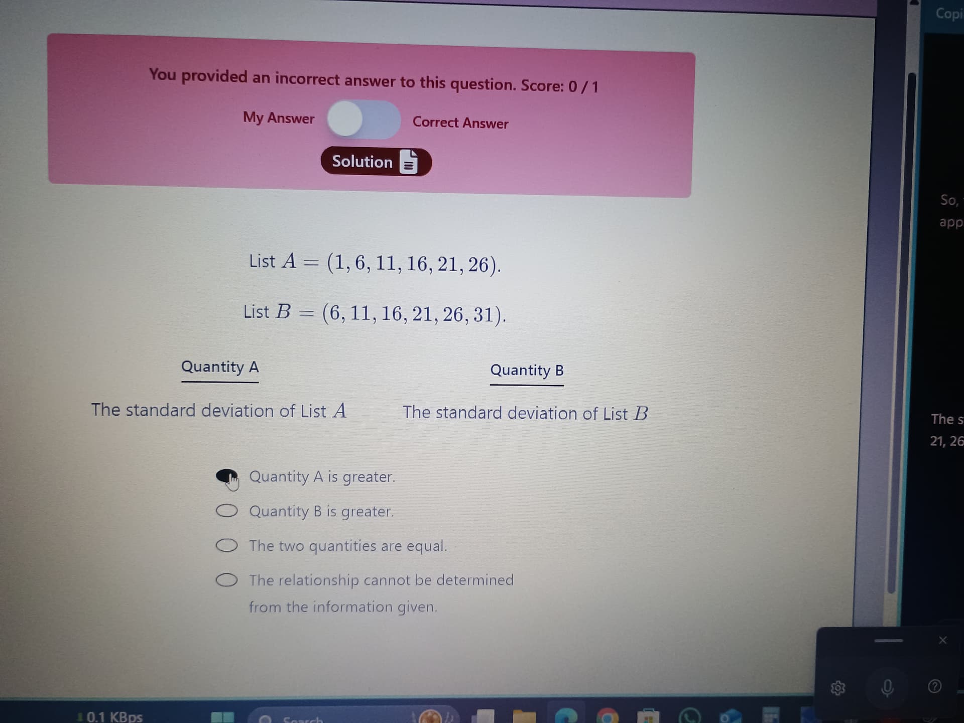 List A has sd 8.54 & list B has sd 8.12 so should not it’s answer is A( is greater) not C(equal)