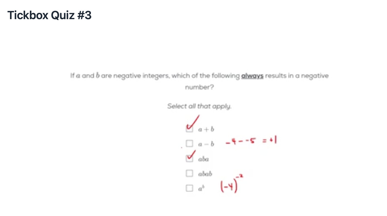 That’s only true if we put the numbers in parentheses. But the answer choice is without parentheses. A raised to the power of b will always get us a negative value, if a is negative and without parentheses