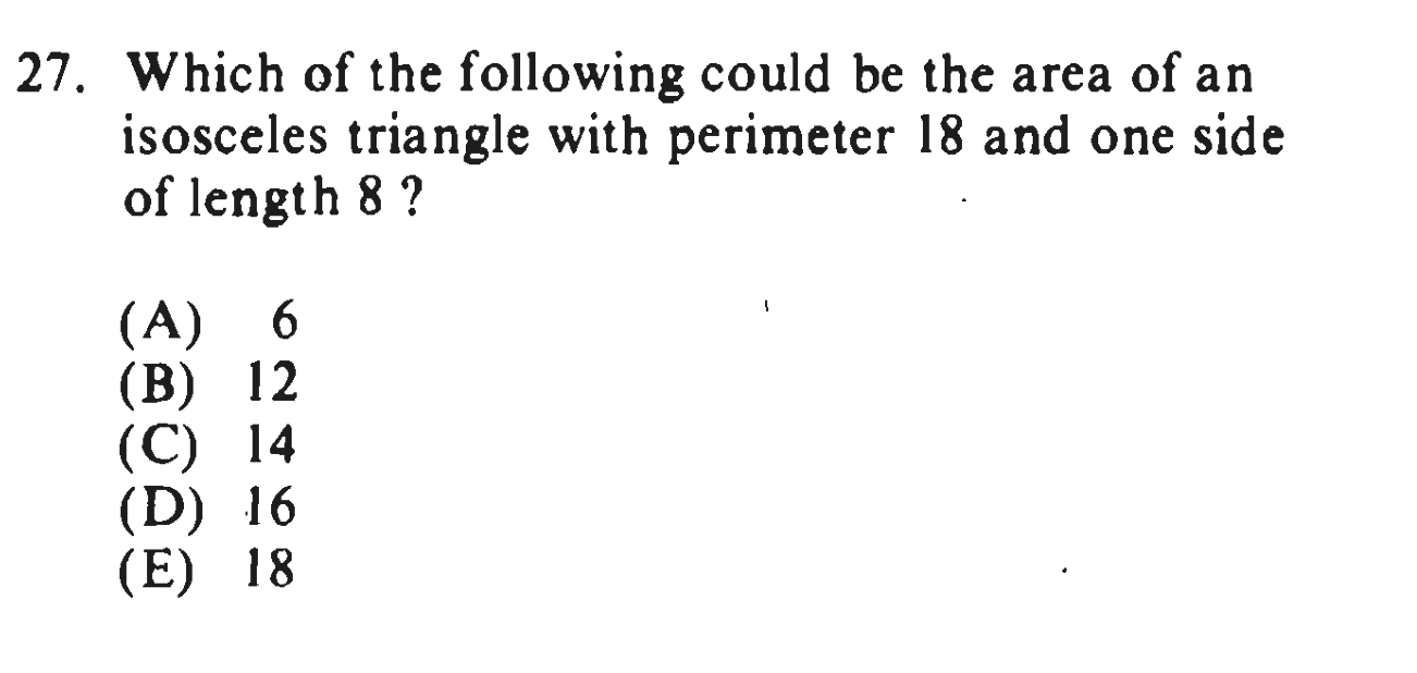 Hi guys, how would you solve this questions? I couldn’t find a suitable explanation anywhere. My process was considering two options for sides (8,8,2) OR (8,5,5). But I couldn’t figure out the next step.