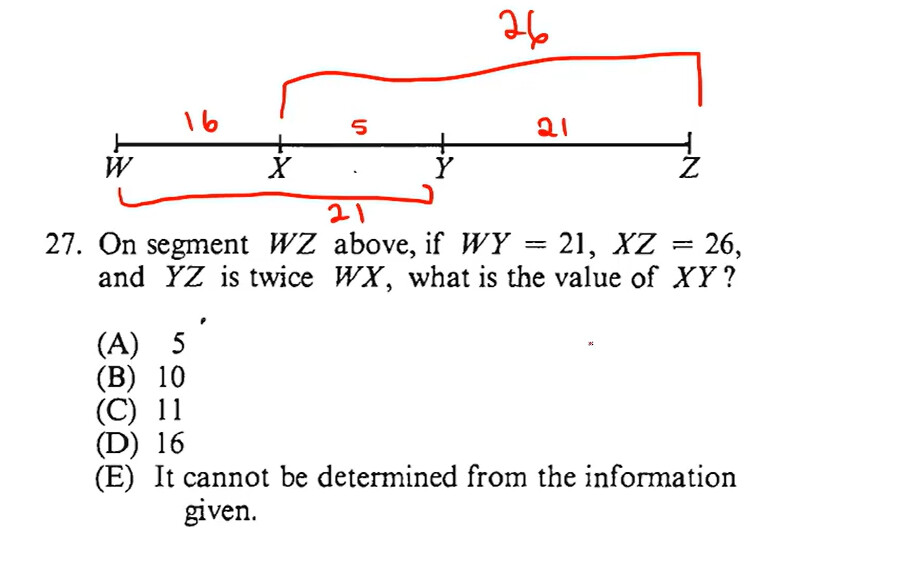 I am very confused on how to solve this question. I originally put 5 as the answer, as per the beginning of Greg’s explanation of the video: 26-21 is 5 for XY. However, when you keep reading, you realize that YZ needs to be twice WX.