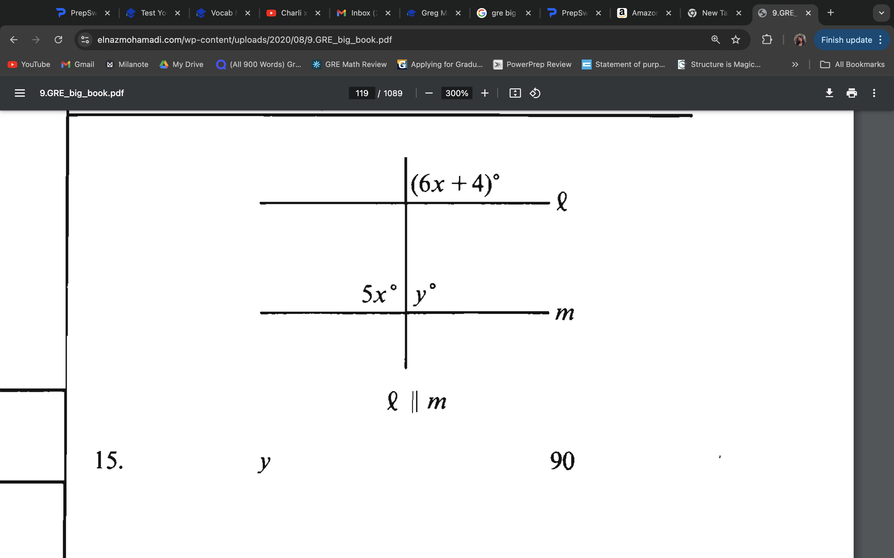 Can someone explain how the answer is A? I know there’s a simple key concept I’m missing. I tried to say that 6x +4 equals 5x, and I know 5x + y = 180.