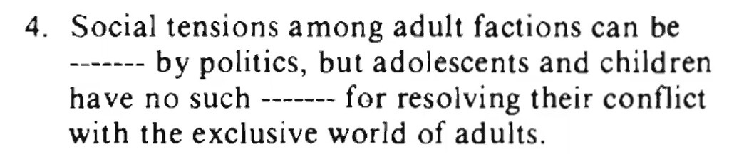 I am unsure if this can be solved on the basis of evidence in the sentence. Even when i give up the outside knowledge whether politics is good or bad, i am unable to come up with words that make sense based on the evidence in the sentence. How can we say that children can not resolve the conflict here? There is a blank in that part of the sentence.