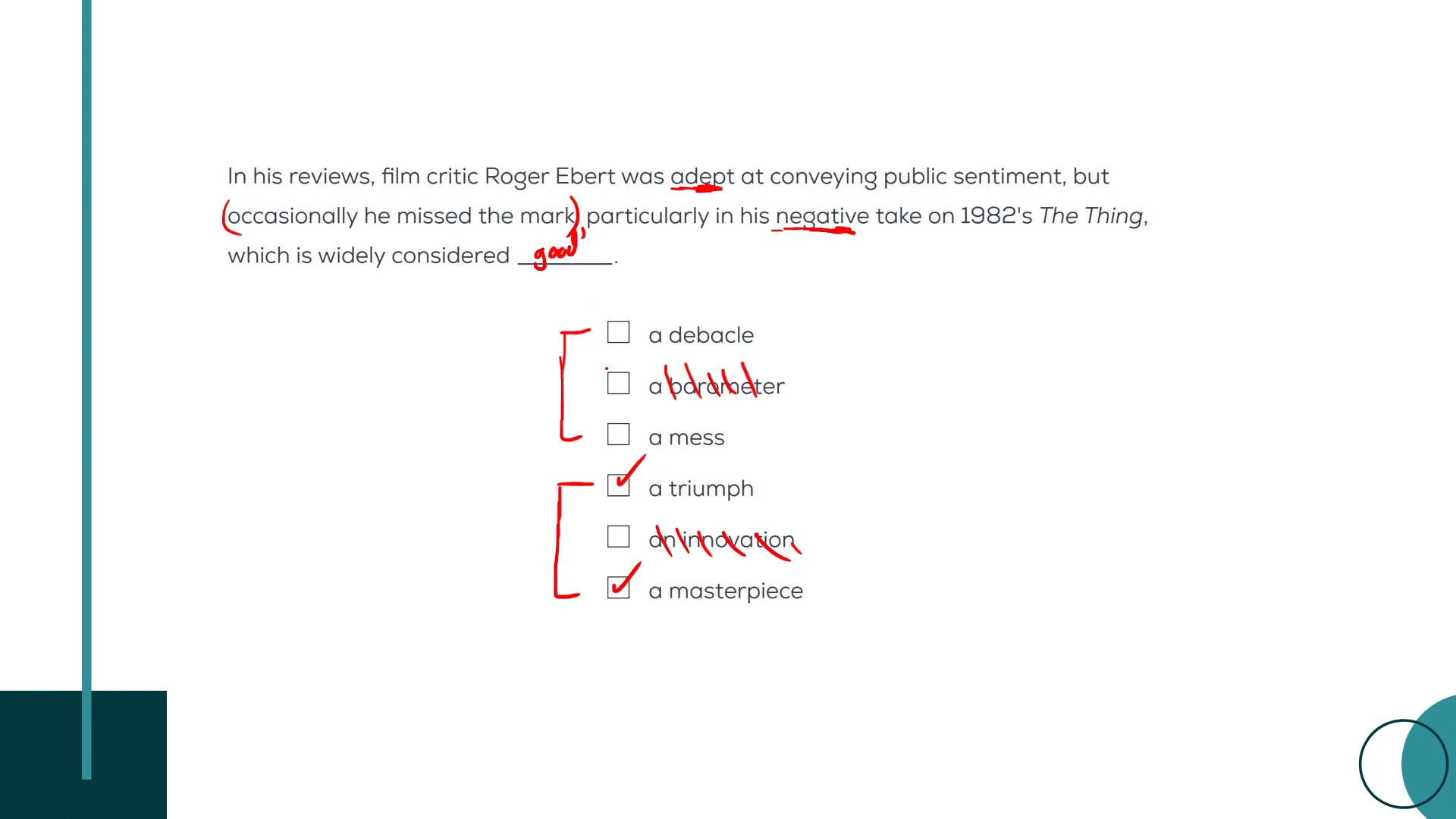 After “but” i understand from the video that the adjective is suppose to be for the movie but I originally read as Roger’ Ebert”s take as the subject instead of the movie. Could someone help rewire my brain to understand why the blank should be describing the movie and not Roger’s take on the movie as the subject?