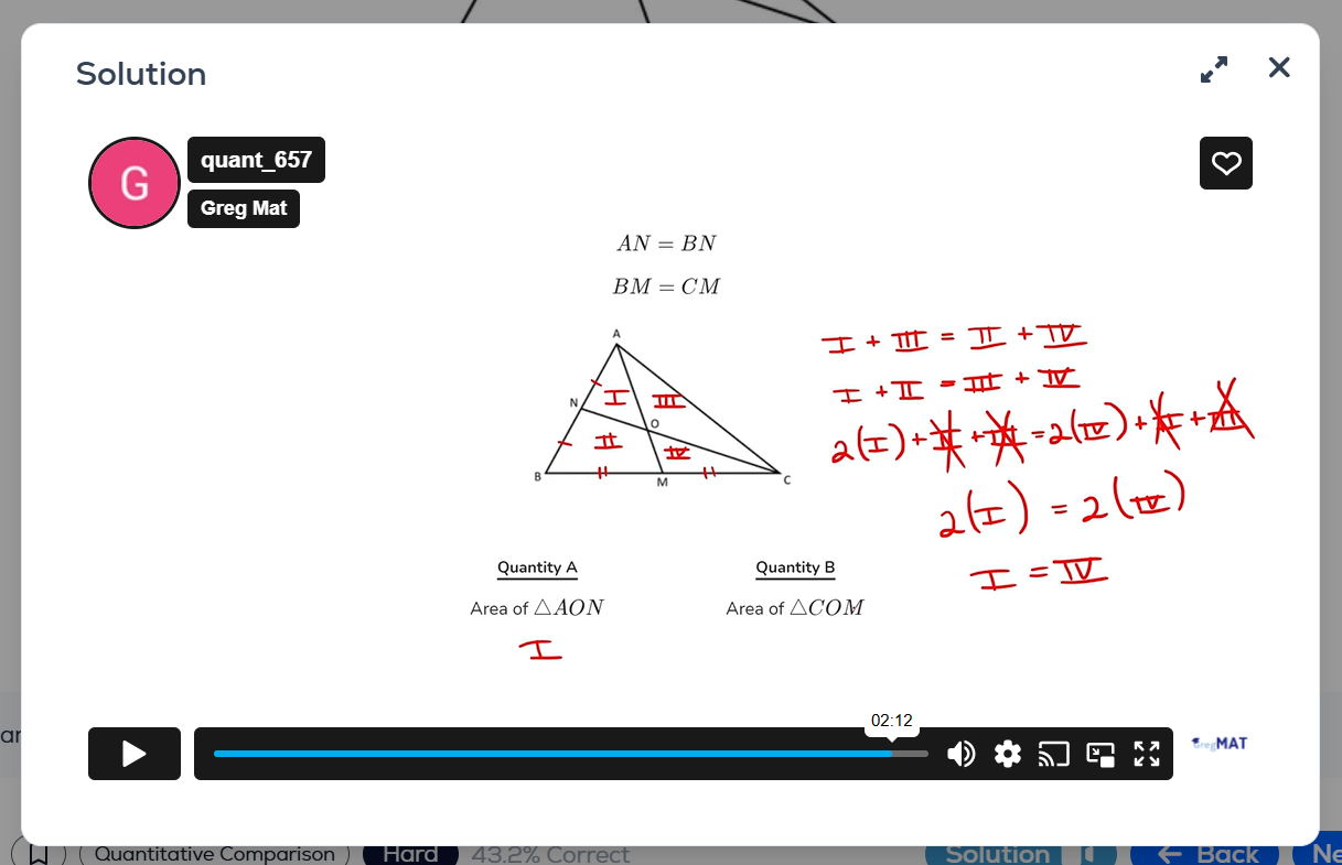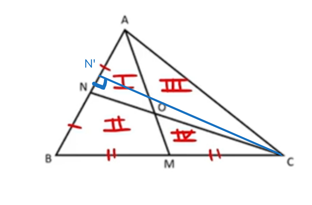 They’re not “equal” (congruent) triangles, but rather two triangles with the same area. This is because the base is the same (AN = BN), and the perpendicular from vertex C to side AB (height of each triangle) is shared by both triangles, ACN and BCN