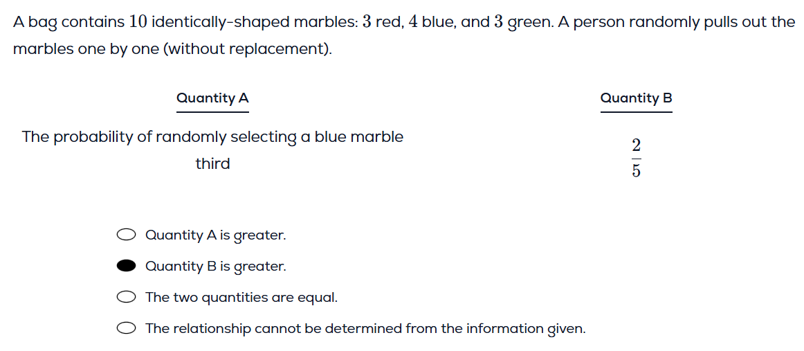 probability of selecting blue third= P(non-blue) x P(non-blue) x P(blue) = (6/10) x (5/9) x (4/8) = 1/6