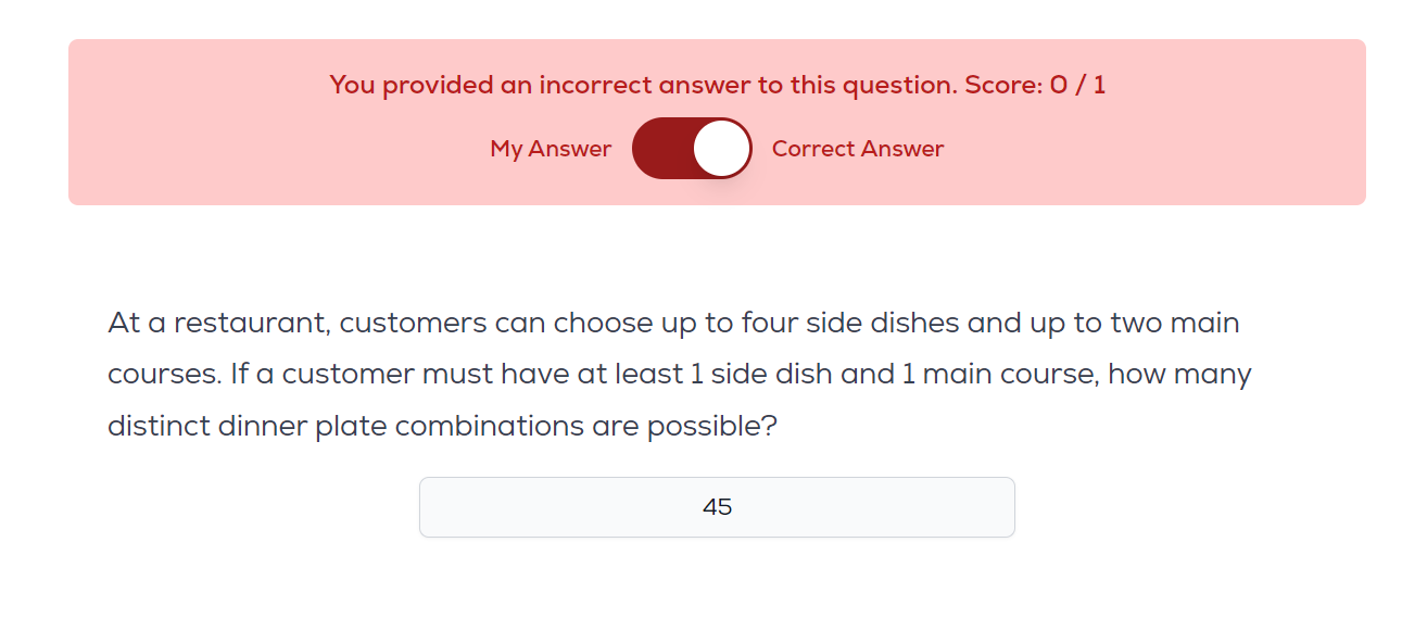 Adding all these 4 gives you 30. To reach 45, you would need to consider the options where customers could chose 2 main course too which will give you 4 more combinations but question doesn’t clearly specify if we should also consider two main course it says must have and not can have. If we were asked to consider two main course possibilities, question should specify can or at least with main course right?