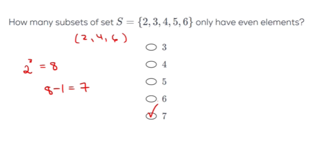That’s the total number of subsets you can form from any 3-element set (the 3 elements here are 2,4, and 6). We subtract 1 because the previous calculation also counts the empty set as a subset.