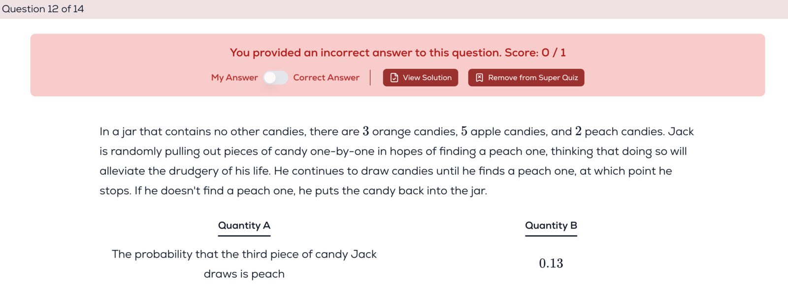 As mentioned, the reason you aren’t just finding the probability of peach candies is the phrase: