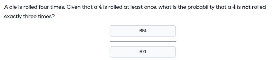 - Probability of rolling at atleast one “4” = 1 - (probability of rolling All not 4 ) = 1 - (5/6)^(4) = (671 /1296)