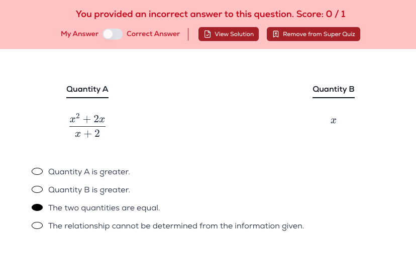 I understand that X cannot equal to -2 because the denominator becomes 0. However, if we apply -2 to the whole expression then we get (4-4)/(-2+2). Simplifying we get 0/0 and the ETS rulebook does say that 0 is a factor of itself so wouldn’t that mean 0 in this case? since 0*0=0 then 0/0=0