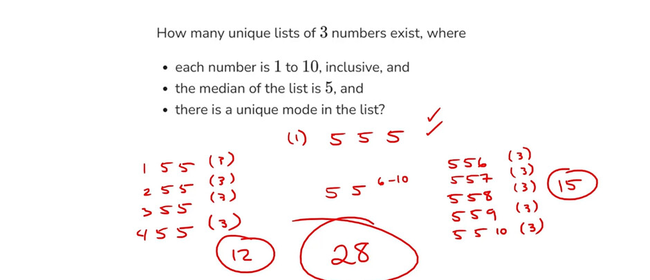Why are we including permutations here? If I change the position of for example 5,5,6 to make it 6, 5, 5 – the list is no longer in ascending order of values (is that okay?) OR 5, 6, 5 – wherein 5 is no longer the median.