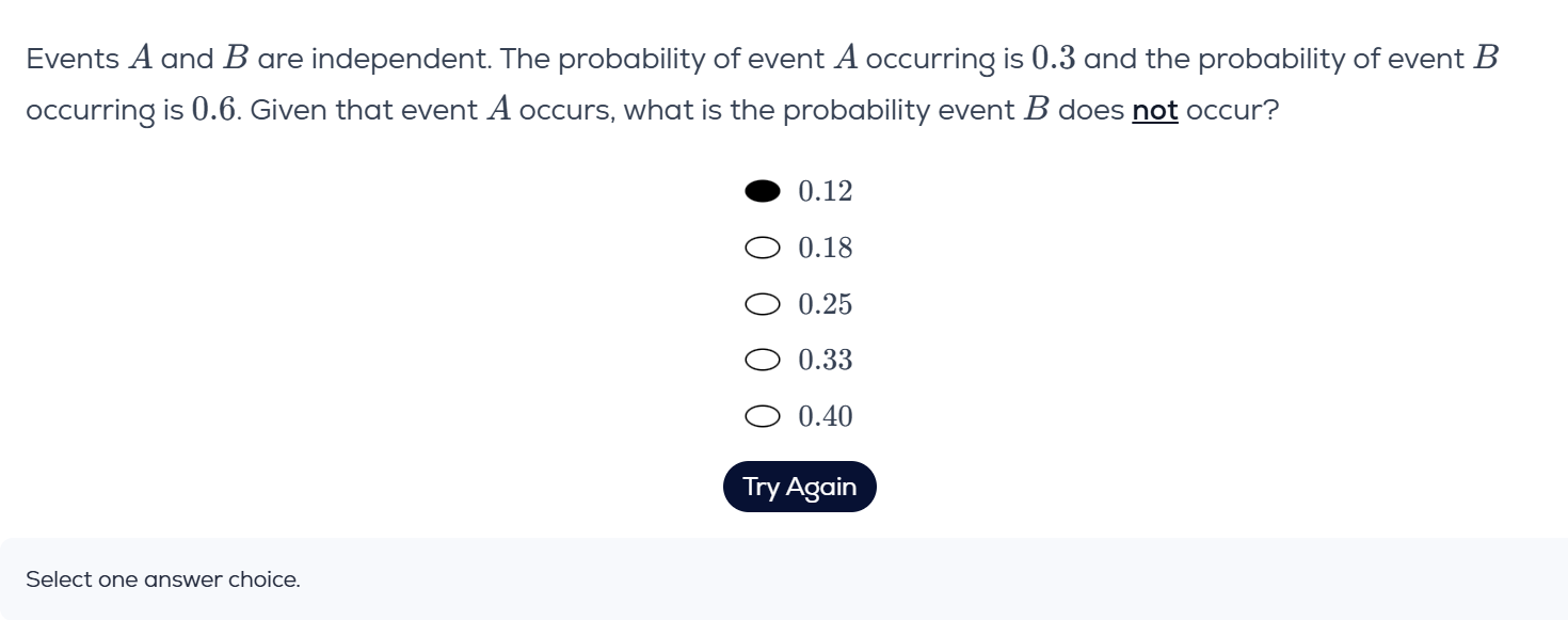 \mathcal{P} (\neg B \mid A) = \mathcal{P} (\neg B) = 0.4