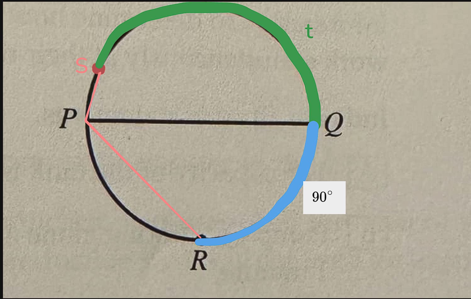 By inscribed angle theorem, \angle RPS must be half the measure of the intercepted arc SQR, and so:
