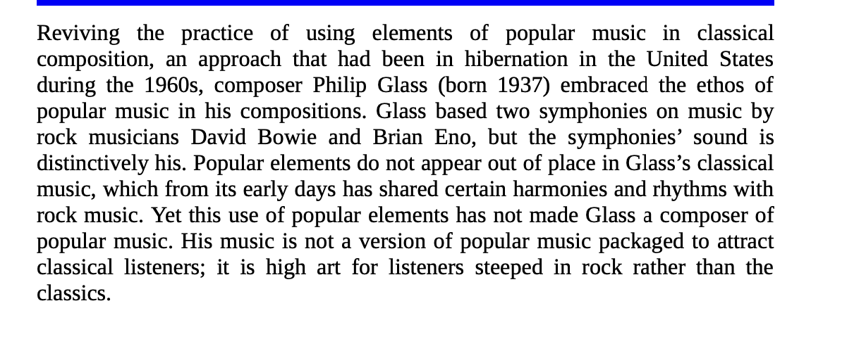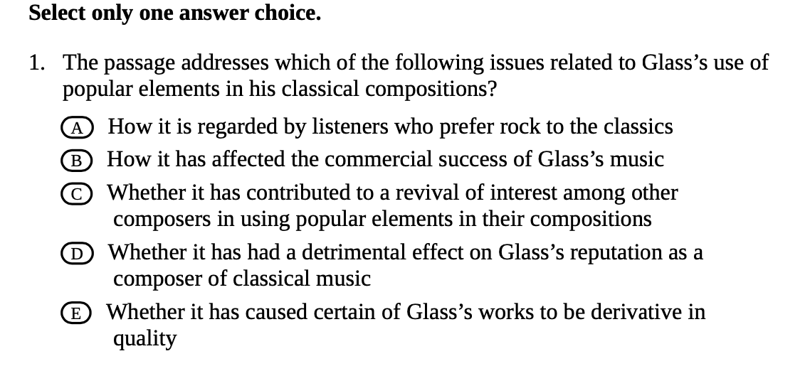 As for question 3: I thought line six (“Popular elements… rock music”) was a good fit, because to me “sharing harmonies and rhythms” sounded like two ways of integrating rock and classical music.