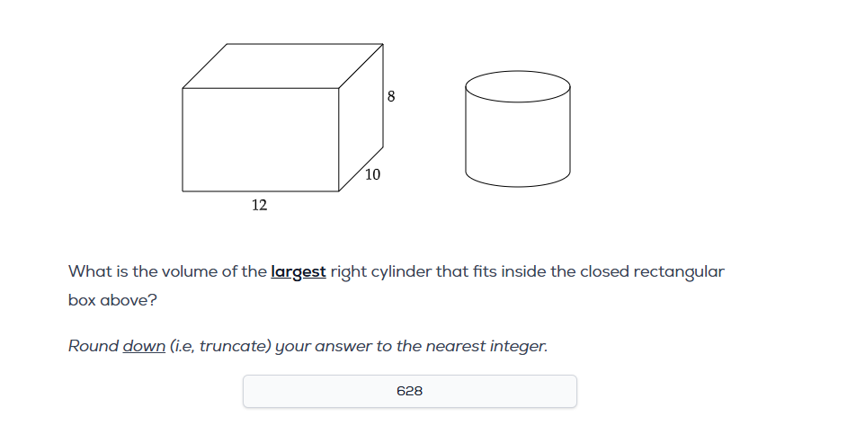 I believe here that we need to find the largest rectangle on the surface of the box so we can create the largest circle. If the sides of the box are 12x10, 12x8, and 10x8 then the largest single face on the box is the 12x10. So the radius has to be 5 because a circle of radius 6 would not fit here. But we don’t need to make the radius 4 because if we put the circle of radius 5 on the 12x10 side, the 8 represents the height of the cylinder.