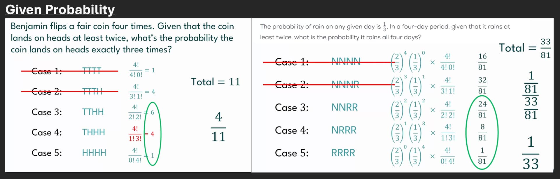 However, for your second question, you can’t employ this method because different outcomes now have different probabilities. For example, the sequence RRNR has a probability of \left( \frac 13\right)^{3} \left( \frac 23\right) , which is different from the probability of an outcome like RRNN, whose corresponding probability is \left(\frac 13 \right)^2 \left(\frac 23 \right)^2.