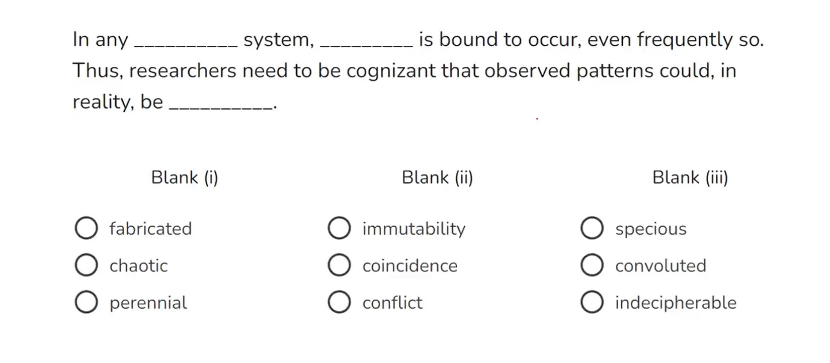 I got the 2nd and 3rd blank correct here. I am confused as to why the 1st blank is chaotic and not fabricated. If the observed patters could in reality be specious, doesn’t it kinda hints that the system is a deceiving one?