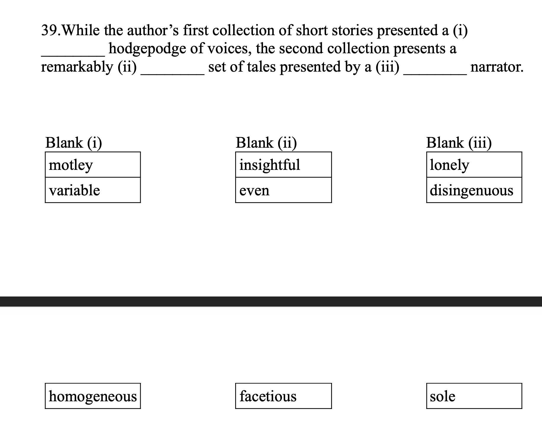 In the second and third blank I got the idea from greg startergies how to do it and got the answer correct , but the first blank I am not able to apply greg startergies, can anybody tell me the resoning behind “motley” being the correct answer for first blank.