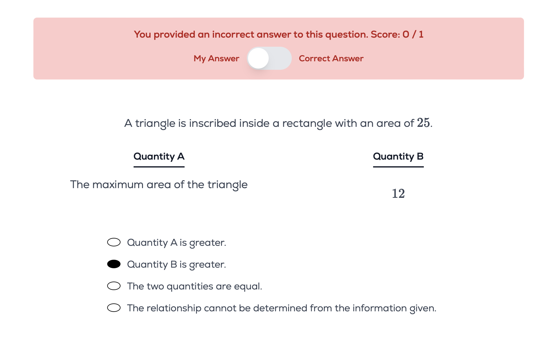 Now, in the question, area of rectangle is 25. So a triangle with maximum area of [25/2 = 12.5] can be inscribed in the rectangle. So A is the answer.
