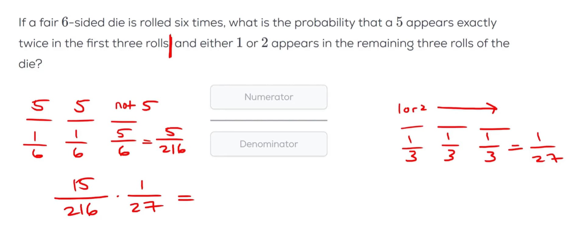 However, for the second scenario, there is only one way you can get a 1 or a 2 each roll: a 1 or 2 the first roll and a 1 or 2 the second roll and a 1 or 2 the third roll. This has probability: \frac{1}{3} \cdot \frac{1}{3} \cdot \frac{1}{3} = \frac{1}{27}.