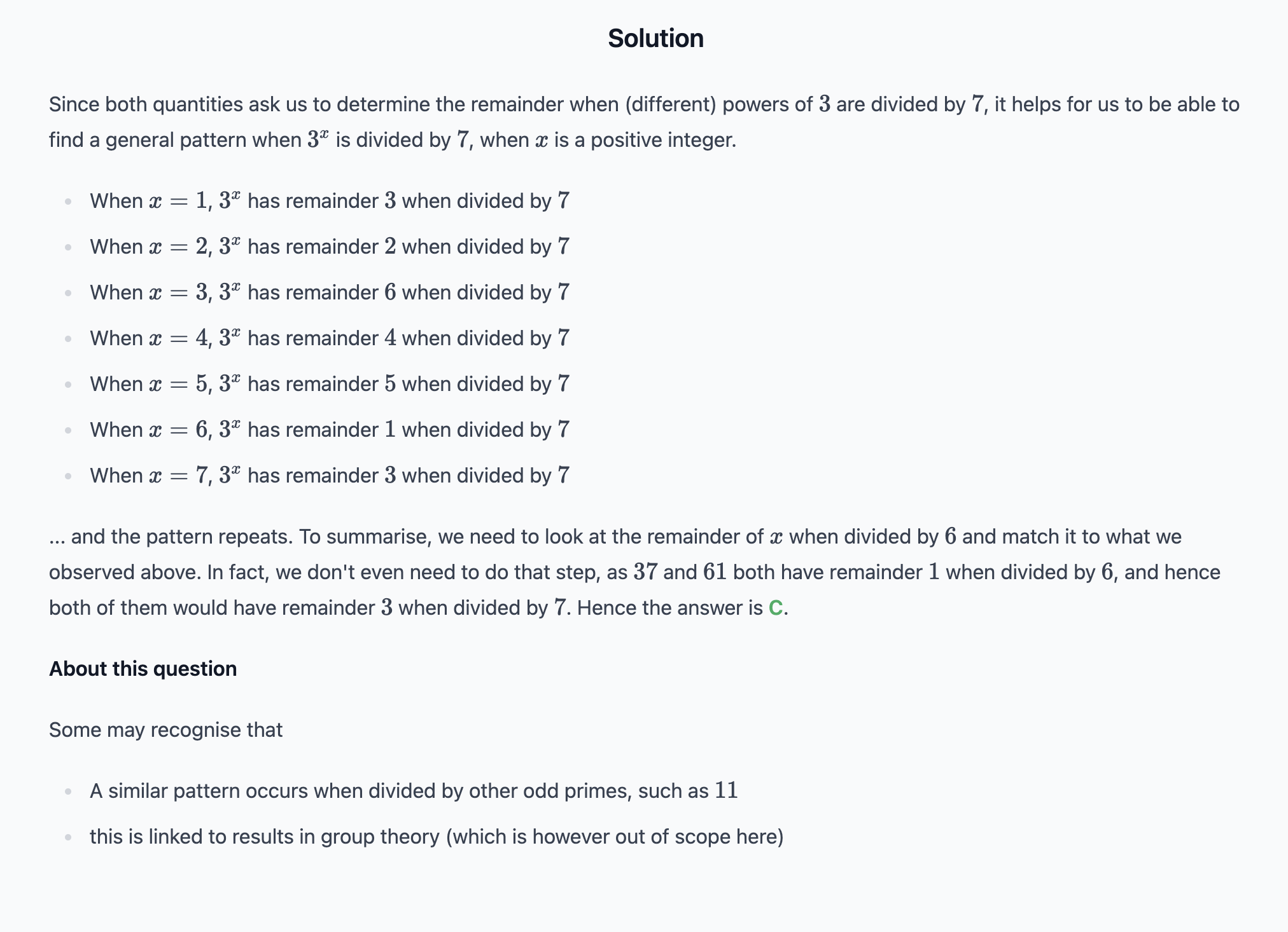 The pattern repeats after every 6th term, so you will divide the power by 6 as the 7th term will have the same value as the first one. So the 37 divided by 6 gives a remainder 1 so the 3^1 and 61 divided by 6 gives a remainder of 1, so we take 3 power 1 term which is have remainder 3 which is equal so c is the correct option. you just test it with some random examples of your own you will understand it better.