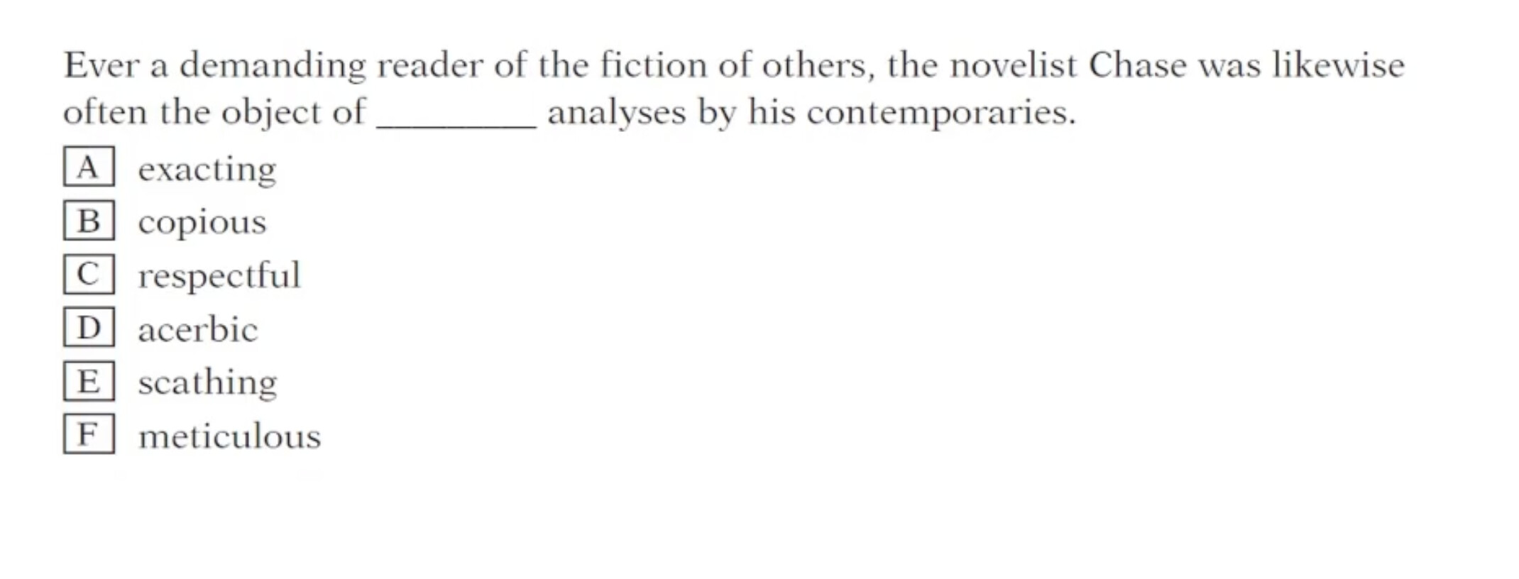 Here I read the the word “demanding” and identified the supporting ideas. My guess was “critical” thinking “if he was demanding of others, he must have been critical of them” and chose “acerbic” and “scathing”. I understand that my thought process involves a little bit of storytelling, but I have come to understand that some ETS questions do require a degree a storytelling. Can any experts help me with what can I drill to correct my process?