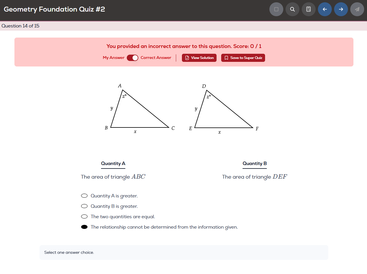 Is this not incorrect? As per Greg, the answer to this is D. Because ASS cannot be used to prove that the two triangles are identical. And as per the explanation only Z is the common angle.