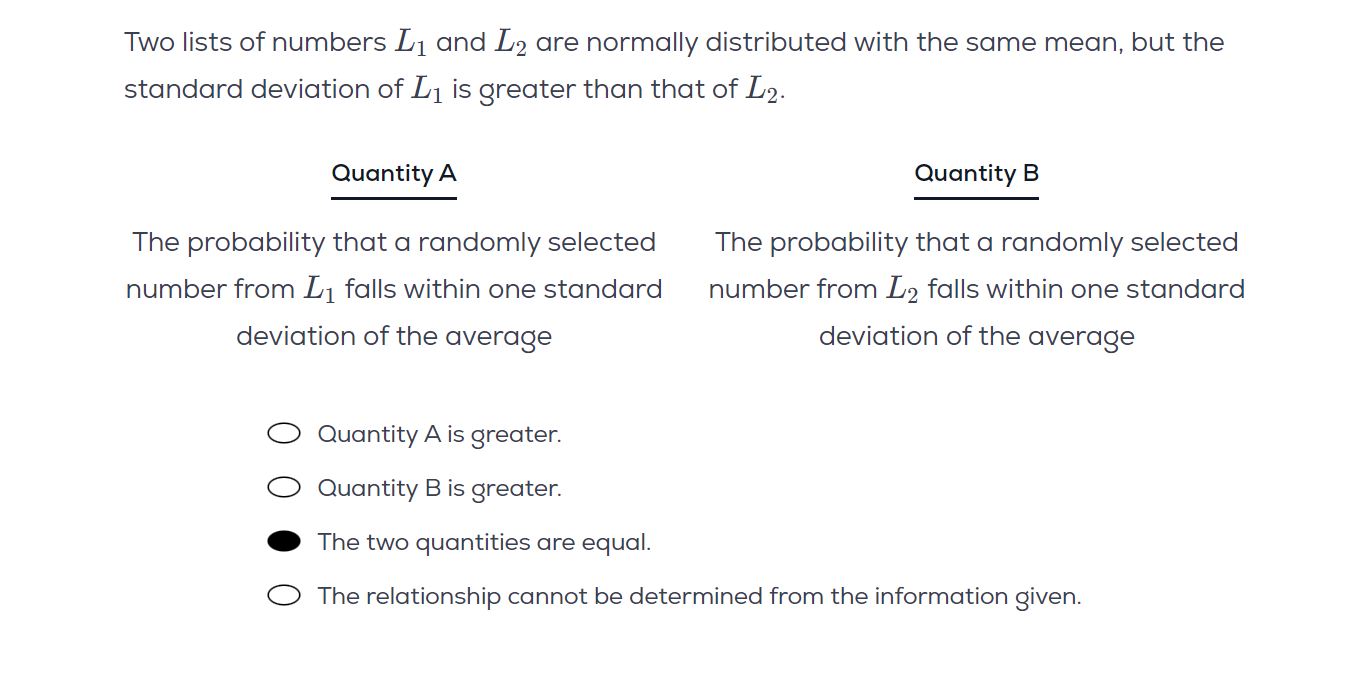 For first question, if the data is more spread out because SD is higher that means values are farther away from the mean right so % of values that falls within one SD is more for L2 than L1 with the same mean. So, why does the answer key shows “two quantities are equal as the correct answer” ?