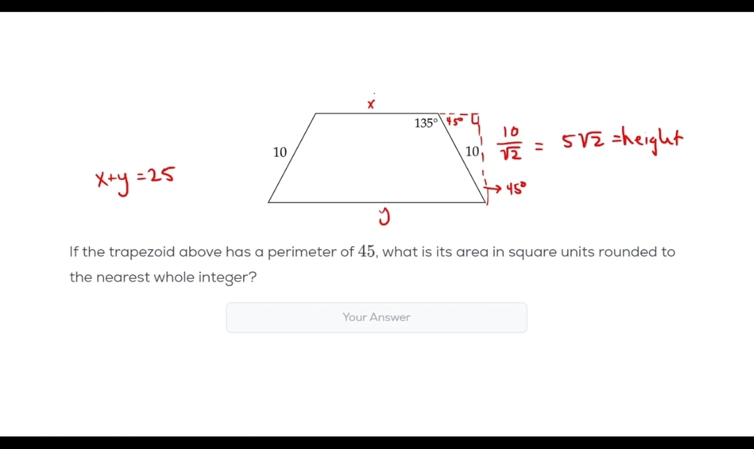 I understood Greg’s solution correctly but I used a different approach for this question and I wanted to understand what issue is there with that as I didn’t get the correct answer. I used the supplementary triangle property since there is one set of parallel lines, the angle adjacent to 135 can be derived by 180-135 which gives us 45 and since other two sides are equal that is 10, the angles opposite to it would be equal too so I assumed that as x.