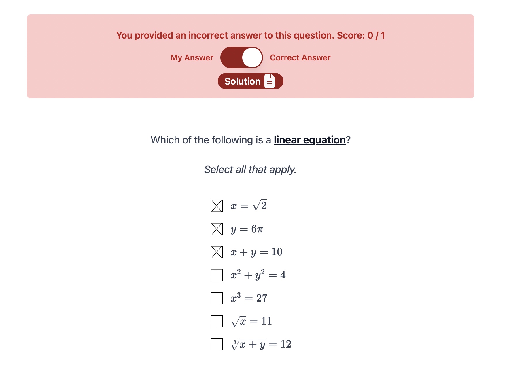 I also checked rt(x) = 11 as an answer but it’s apparently not a linear equation. Can someone please explain why? Its graph is a straight line. Thanks in advance!