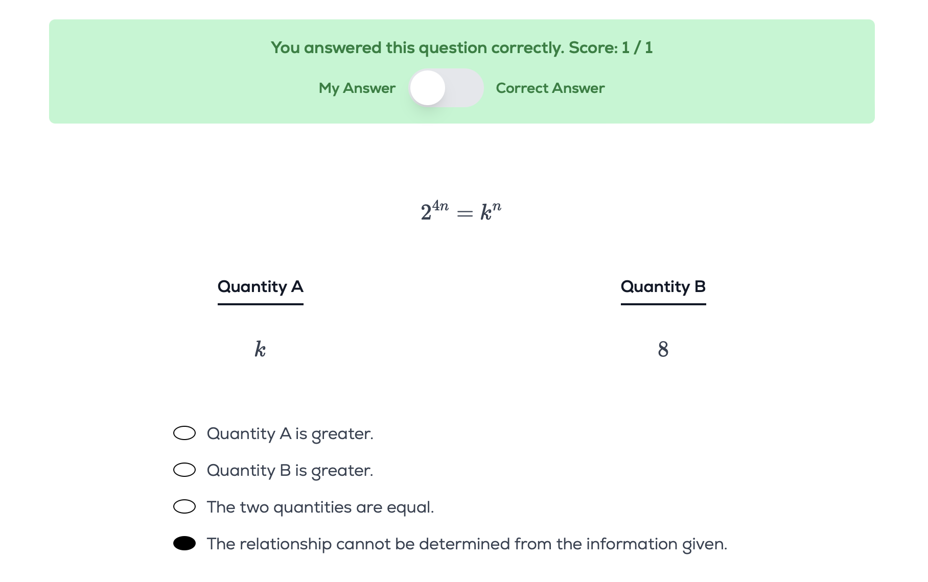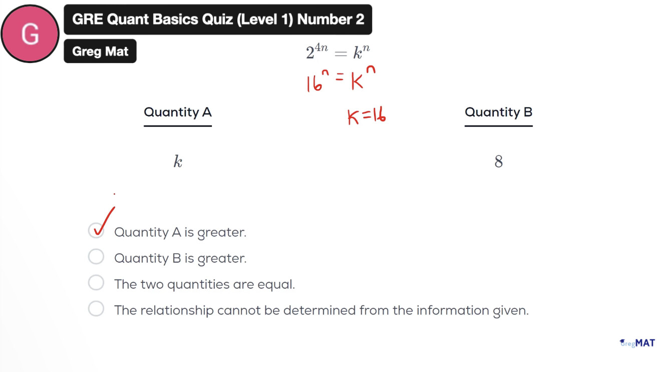 Here, Greg says the answer is A in the solutions video - which was my initial answer. But later on I figured that it could also be 4^2n therefore k could be less than 8 (4) and greater than 8 (16). which is why I marked D.
