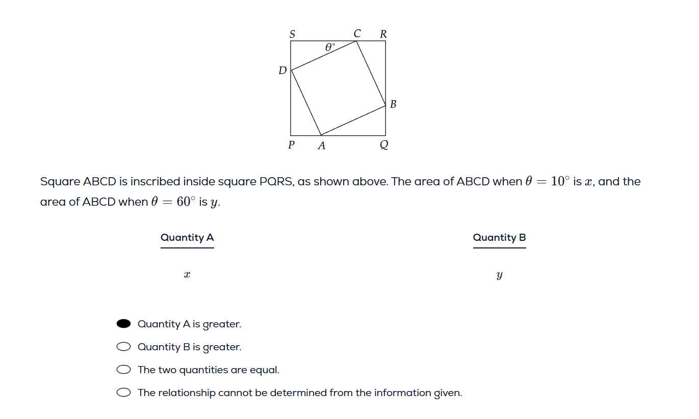 So the area of the inner square is increasing as the theta approaches 60 degree but how can we objectively conclude the its area at theta 60 < compared to when theta 10 degree?