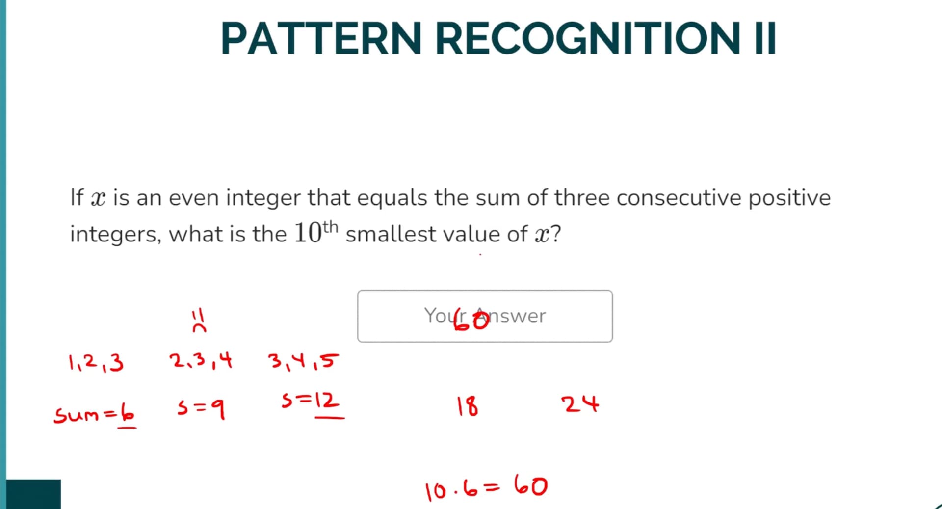 In the Pattern Recognition II prepswift, video, Greg says that 10 6 is the answer to this based on the pattern screenshotted below. However, the pattern I got was 3 (n+1) ex. 1+2+3 = 6 ( or 3*2), 2+3+4 = 9 (or 3*3), 3+4+5 = 12 (or 3 *4), etc. So I answered this as 3 *11 = 33. Am I missing something in the question that I didn’t understand? I’m not understanding Greg’s logic.