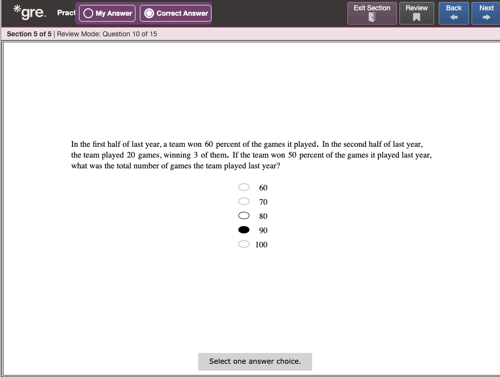 Got this one wrong. Upon reviewing, the only way I can think to solve a question like this is back solving, but I’m wondering if anyone has a quicker approach. Start by subtracting 20 from the answer choice to see how many games were played in the first half of the year, then multiply this number by the win rate (60%). Add the result to 3 and divide by the answer choice.