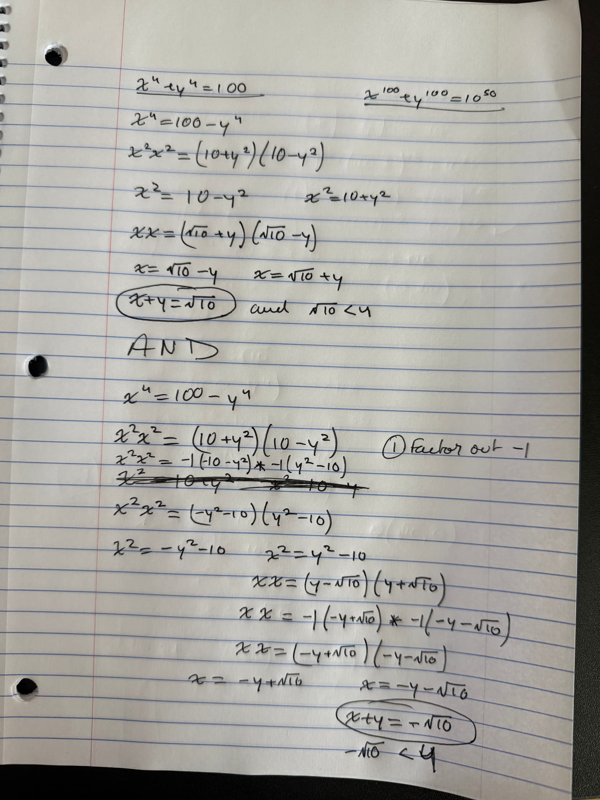 x^{100} + y^{100} ={\big(x^{25})}^4 + {\big(y^{25})}^4 = 10^{50}