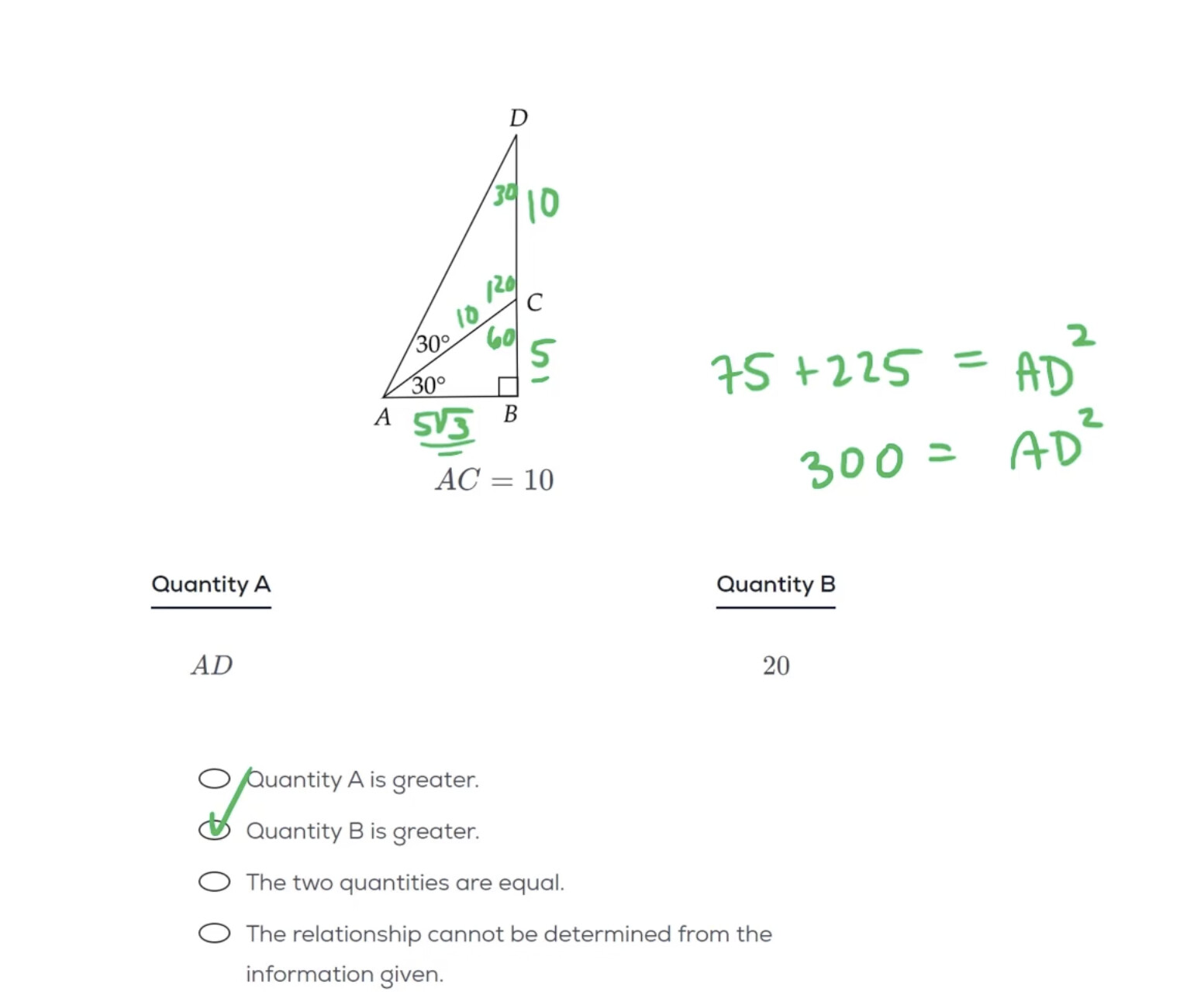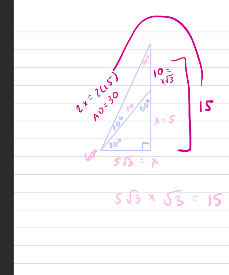 For the last question on quiz #10, why does greg solve it with pythagorean theorem so the result of AD is 17.4 and not with the 30 -60-90 rule like i did below where AD = 30