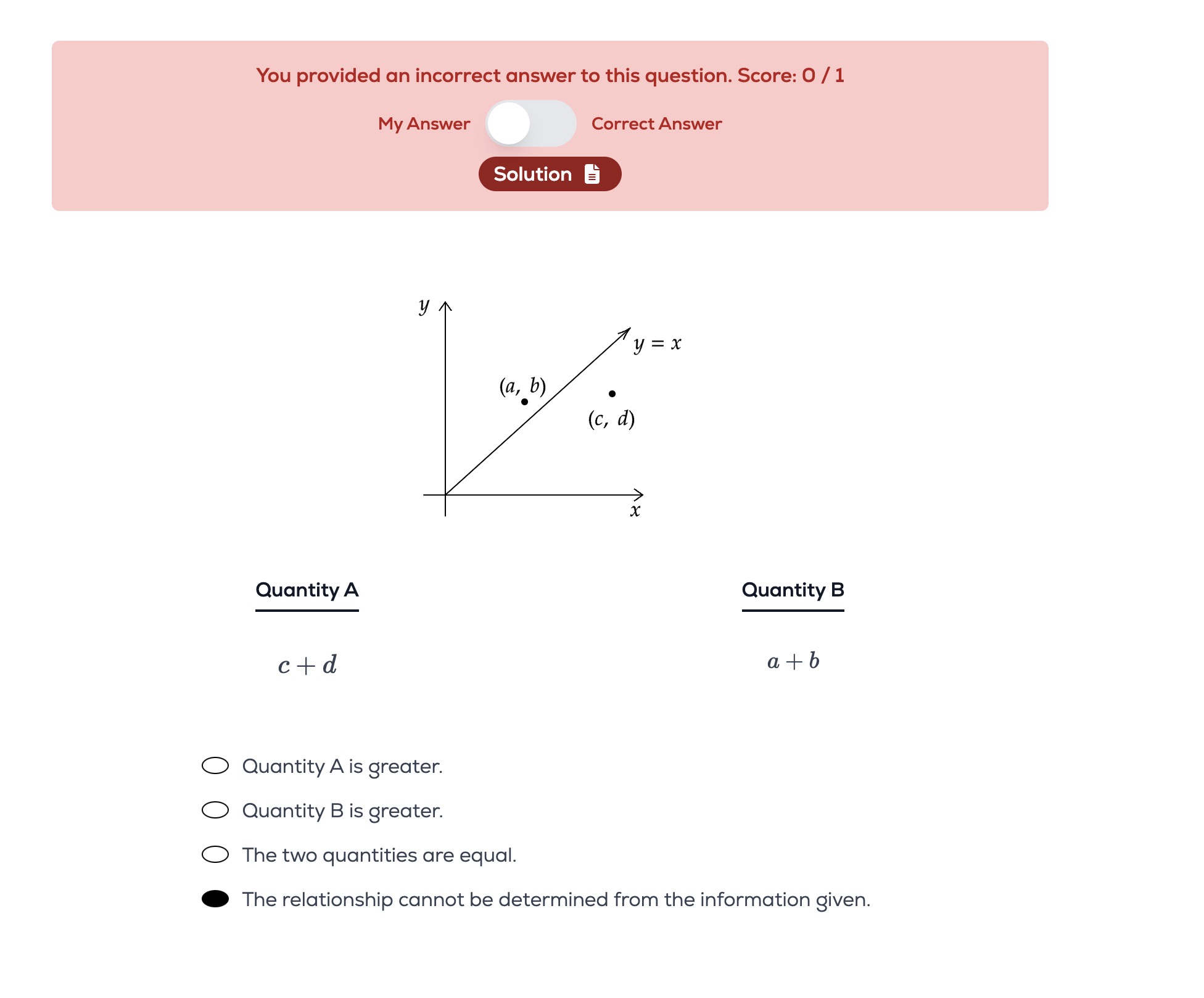 Yea, I think we can make a deduction by looking at the graph that (c,d) has a higher x and y value when compared to (a,b). Also, even if b and d were the same y-value, c > a which makes quantity A greater.