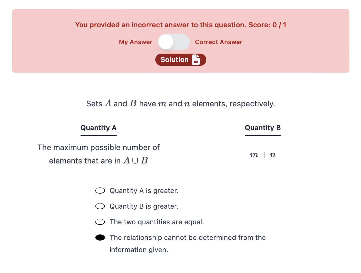 If the sets share values ( A (1,2,3,4); B (1,2,5,6), however, the maximum possible amount will be smaller than adding the total elements of both sets. e.g. 6 non-repeating values as maximum possible values vs. 8 (m+n) → Quantity B is greater?
