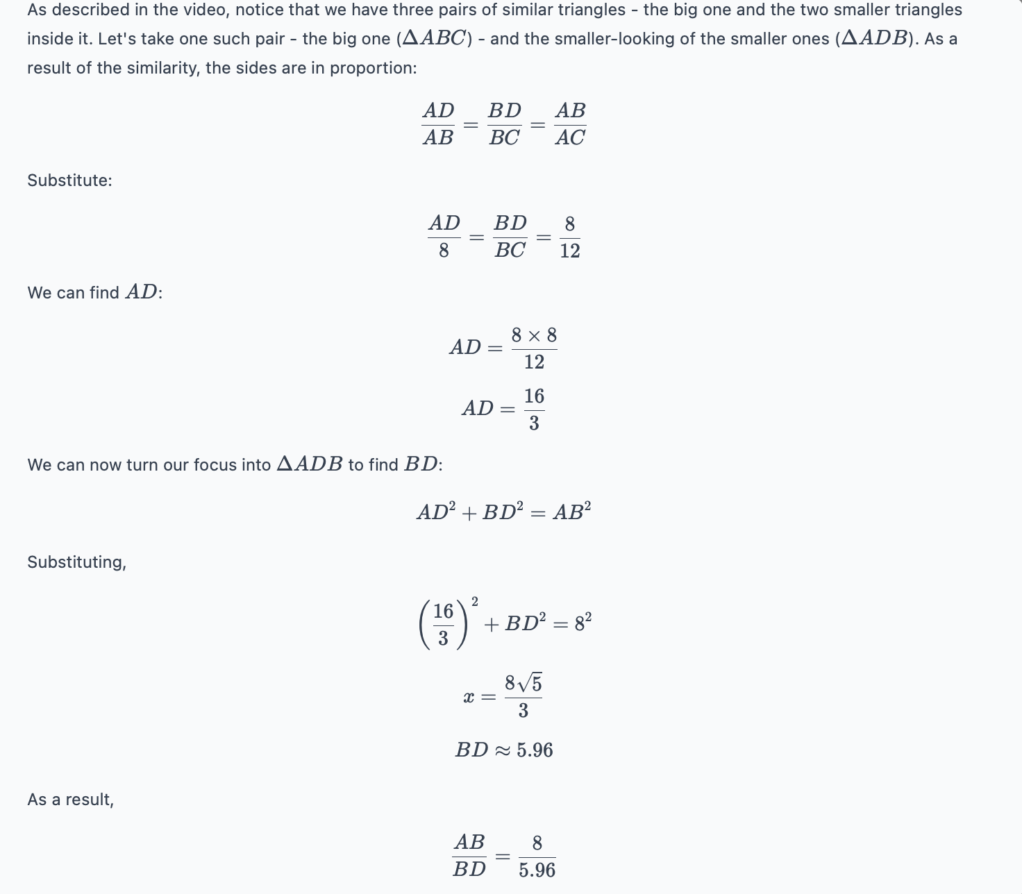 Do it as b is 90° so according to Pythagoras the side bc is also 8 hence both angle a nd c are 45 in triangle ABD a is 45 d is 90 so a is also 45 hence now use 45 45 90 triangle and then bd become 8 /root 2