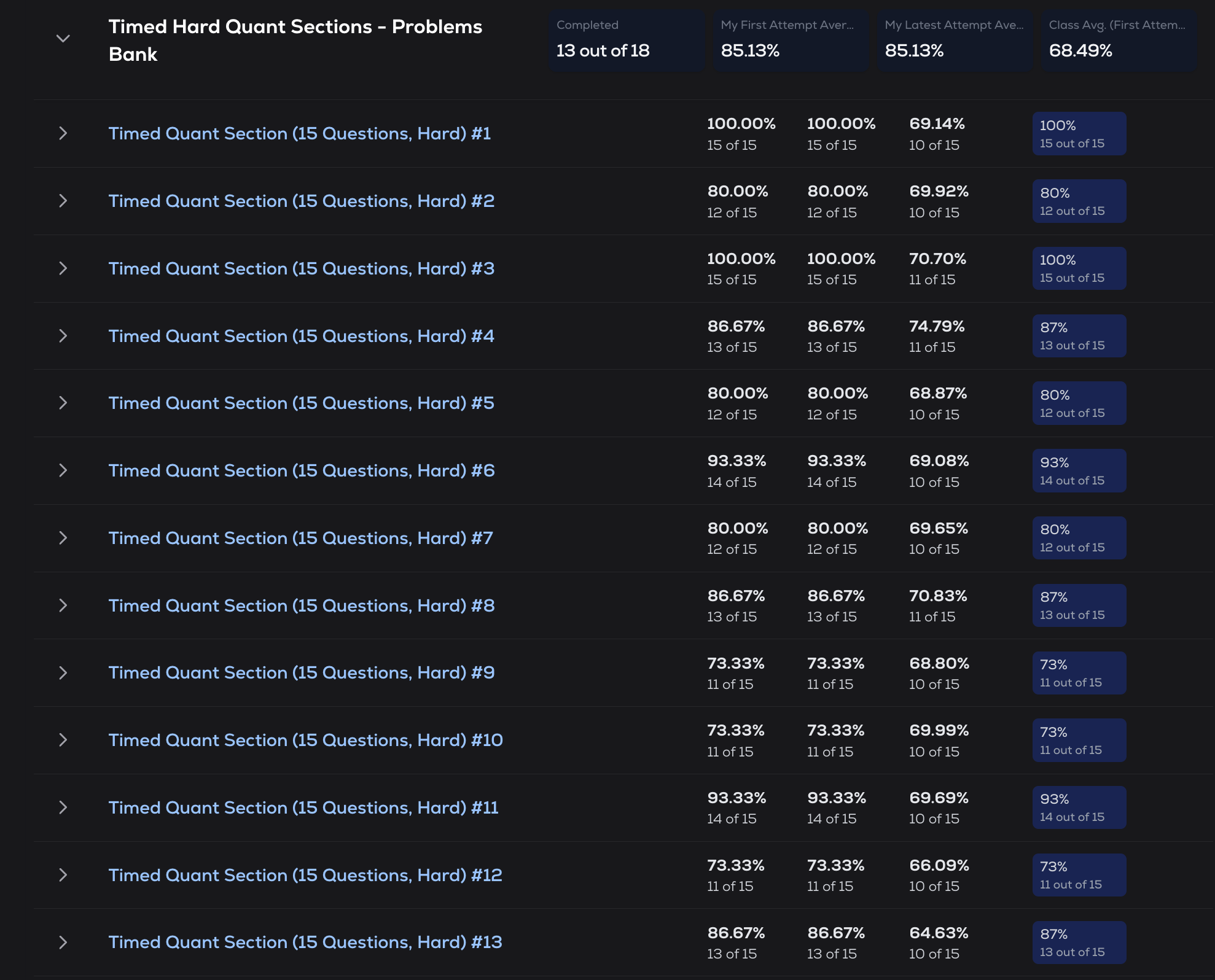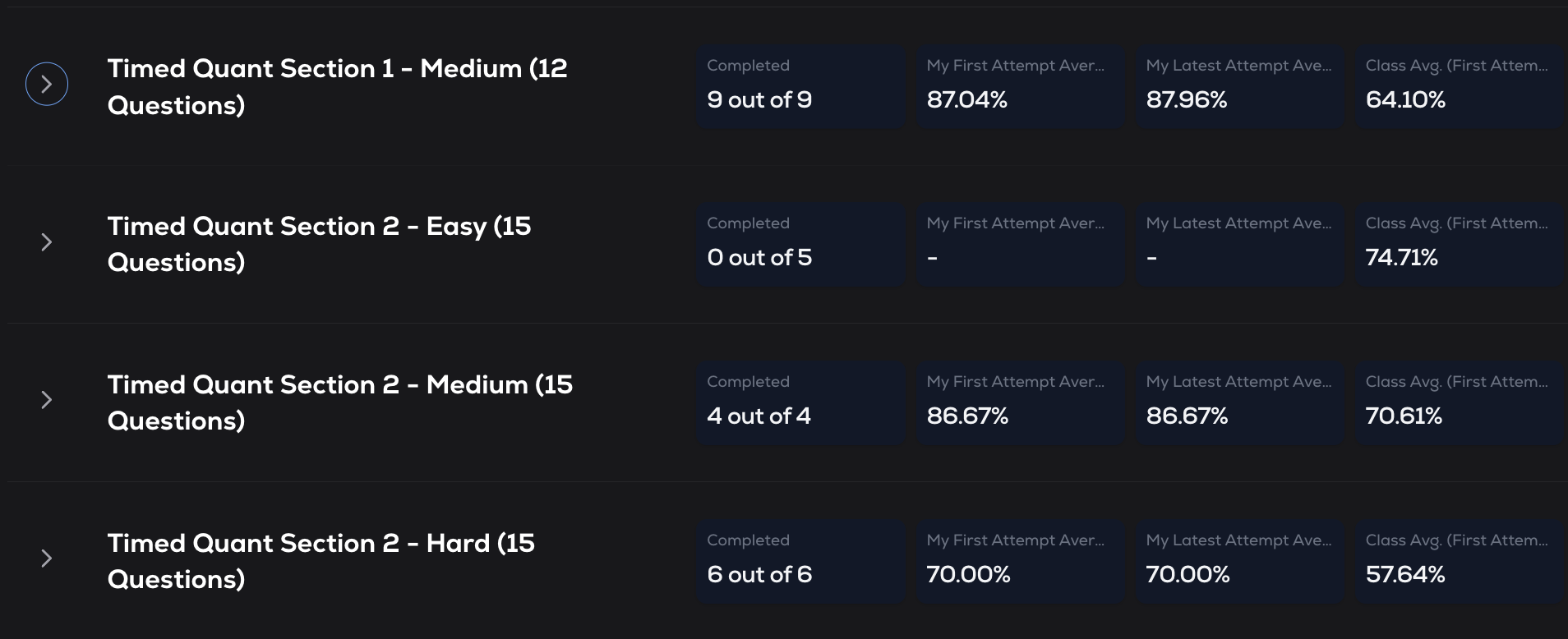 Above show my scores on the Timed Hard Quant Sections. I took Practice tests 2 and 3 and had 11/12 (Medium), 11/15 (Hard) (169Q) on PT 2 and a 10/12 (Medium), 8/15 (Hard) (163Q) on PT3; here I got lucky on PT2 because I had seen some of the questions before and a little unlucky on PT3 because I made a few careless errors.