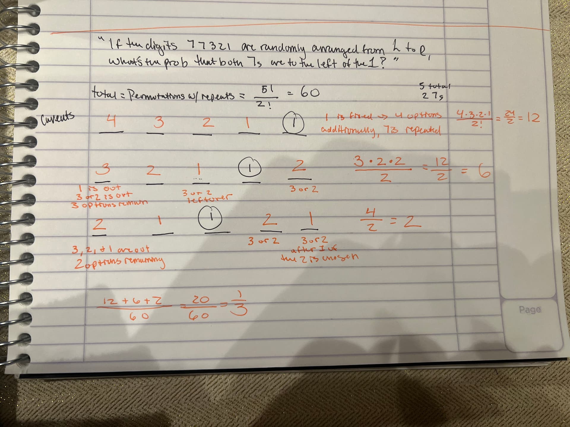 I was solving this attached problem from one of the GRE mini exams. I understand the solution completely. However, i’m curious: if the problem stated that 3 of the digits were 7 instead of 2 (for example 777321), would we divide by 3 or 3 factorial throughout the process in order to get rid of the repeats?