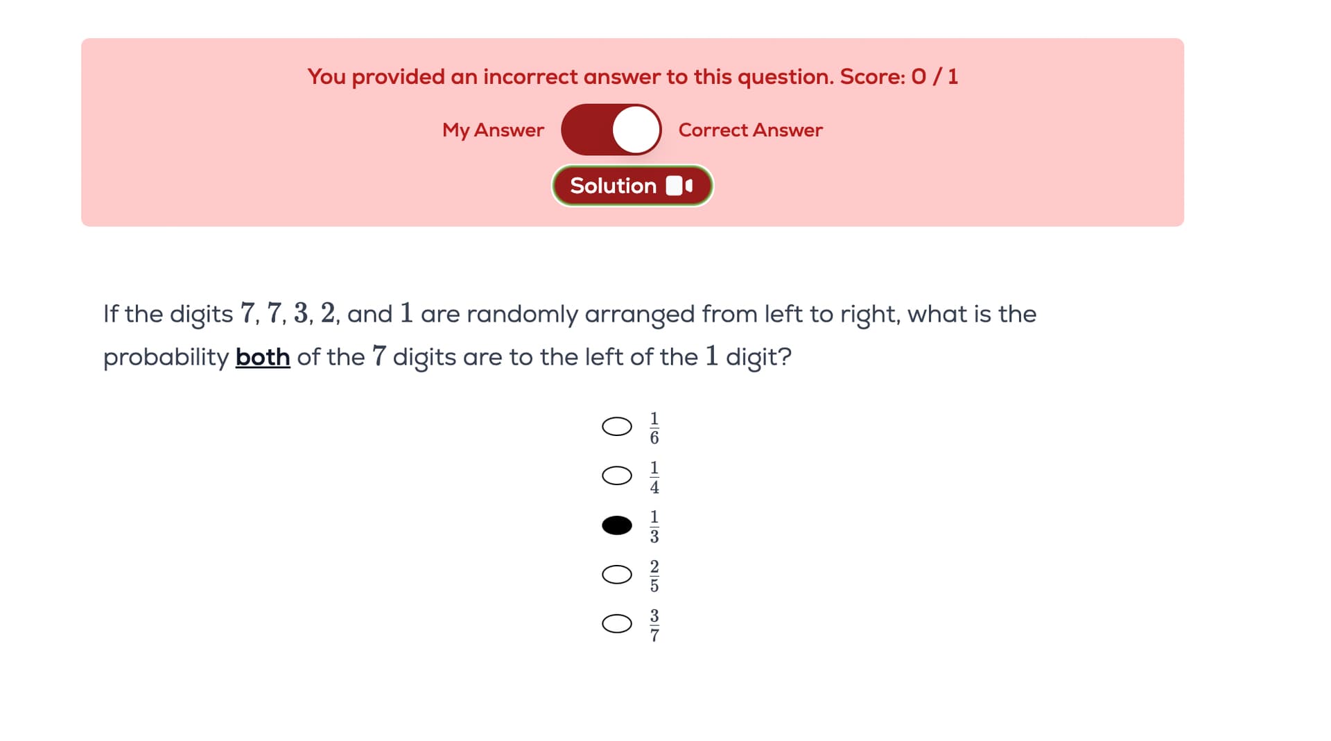 As a bonus, there’s a super easy way to do this problem in which u can just ignore the presence of 3 and 2 and compute the probability that both the 7s are before the 1 in \{7,7,1\}. You then easily arrive at \frac 13.