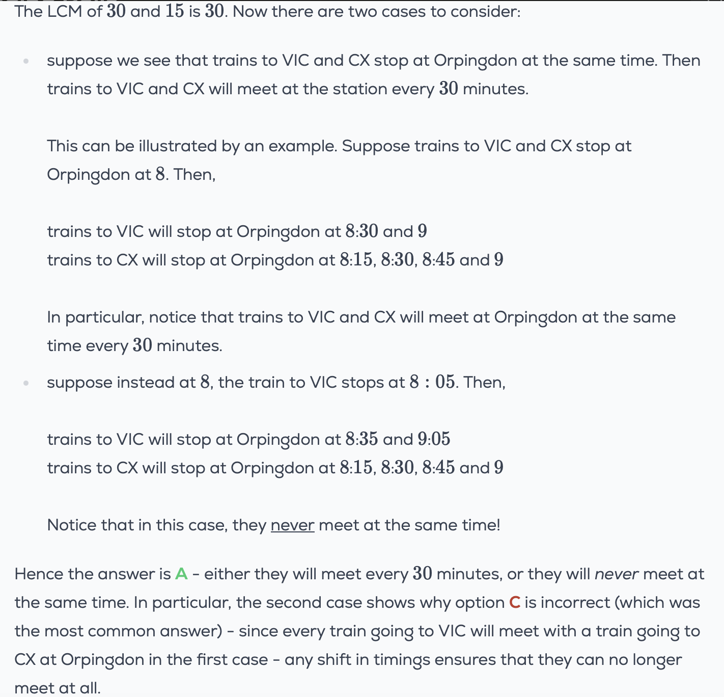 In the second case of the trains starting to run at 8:05, the trains running to VIC would be at 8:05, 8:35, 9:05, and so on. Which is 30 mins from 8:05. Should the trains running from CX not be 8:20, 8:35, etc, rather than 8:15, 8:30? 8:20 would be the time 15 minutes after 8:05, so I’m confused why the solution states 8:15.