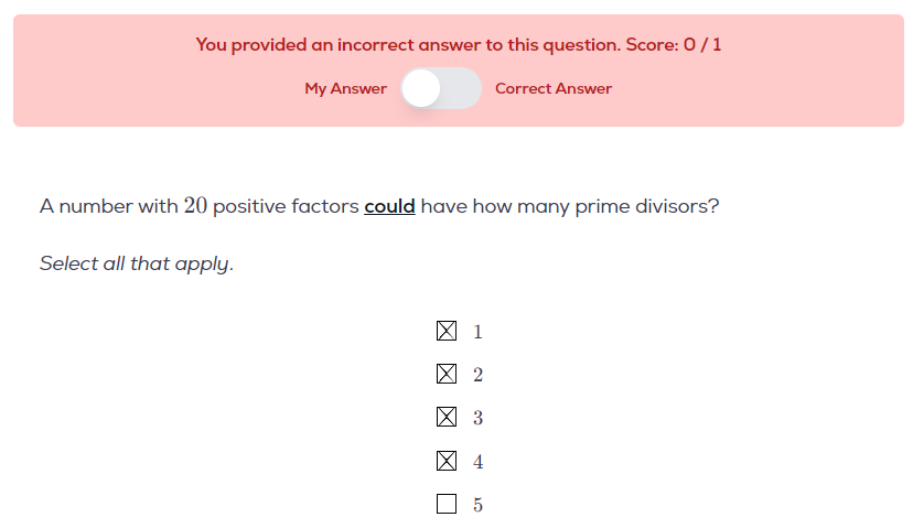 Hello, if the question says “could”, it could have 4 prime divisors since it would be a^1*b^1*c^1*d^1 \rightarrow 2^4 = 16? I understand that if a^2*b^1*c^1*d^1 = 24 and it couldn’t be, but there is one case in which it has 4 prime divisors.
