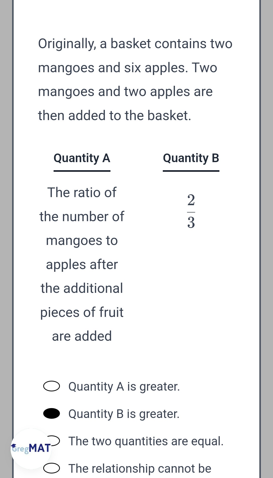 Greg said we can’t determine the absolute value as the total number isn’t given then why is the answer "b"of mangoes/apples question?? There isn’t any total number mentioned!