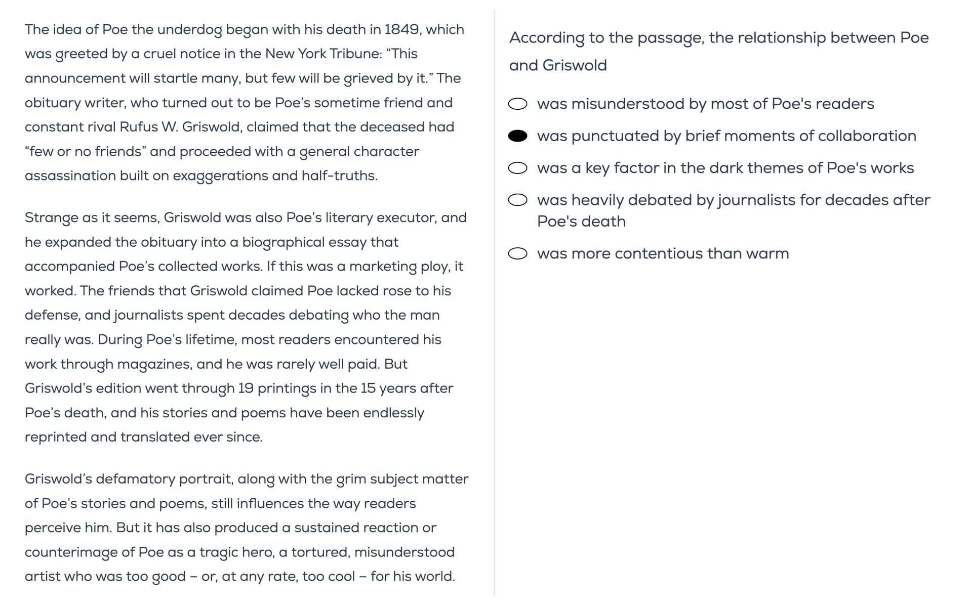 I understand the answer is E, but what evidence tell us that B is wrong? Griswold and Poe were sometimes friends but constant rivals. But second paragraph mentions that Griswold was the literary executor for Poe so that suggests they worked together which supports option B (collaboration)?