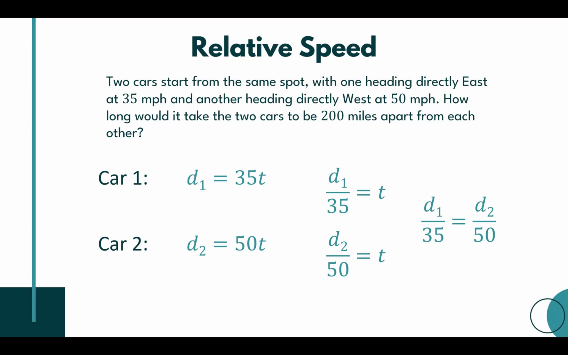 You can use easy numbers to clarify the logic. What happens after one hour? Obviously the cars have different rates and different distances, but they both traveled for t, in this case, one hour. Now apply that logic to the question.