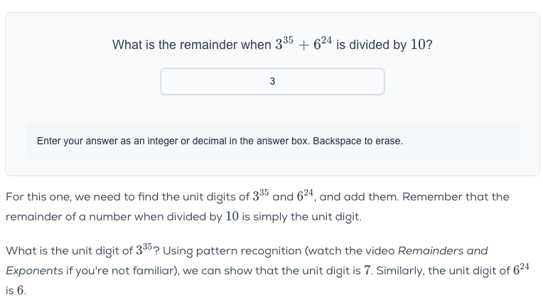 I’m having trouble with recognizing the correct pattern in addition with large exponents. For example, this remainders and exponents question.